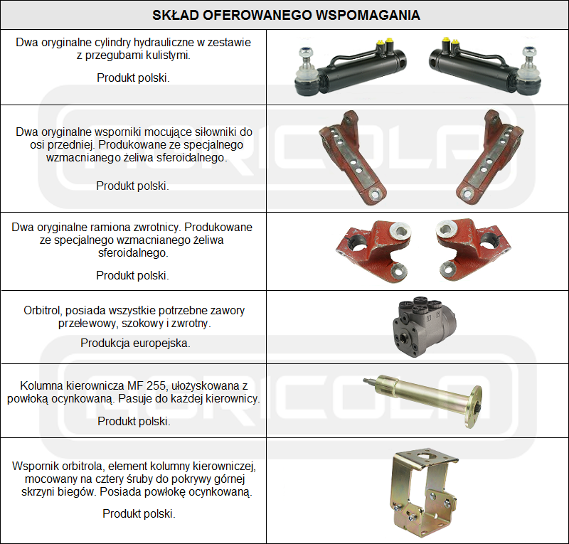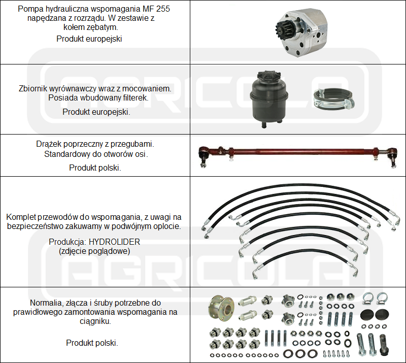 Kompletny zestaw - wspomaganie kierownicy MF 255 oraz Ursus 3512 i pochodnych modeli 3-cylindrowych. Jest to kompletny układ oparty na orbitrolu marki DANFOSS, lidera w zakresie hydrauliki siłowej. Nie wymaga on dodatkowych elementów oraz przeróbek. Produkt jest zaprojektowany z myślą o rolnikach oczekujących najwyższego komfortu prowadzenia oraz trwałości w różnych warunkach pracy.