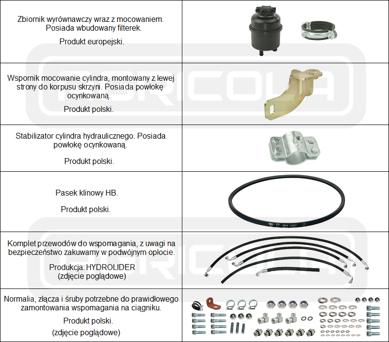 Zestaw pasuje do każdego rocznika oraz każdej wersji kabiny. Instalacja wspomagania nie wymaga żadnych przeróbek konstrukcyjnych. Wystarczy wymontować stare elementy i zastąpić je nowymi częściami z kompletu. Wszystkie otwory montażowe i mocowania zostały precyzyjnie dopasowane do fabrycznych miejsc w ciągniku.
