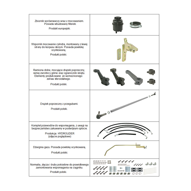 Oferowany zestaw jest kompletny oraz kompatybilny z oryginalnym układem ciągnika. Jest to produkt stworzony z myślą o rolnikach oczekujących najwyższej jakości oraz trwałości. W zestawie znajduje się między innymi oryginalny orbitrol DANFOSS. Jest to gwarancja precyzyjnego oraz płynnego sterowania. Wyposażony w zawory: przelewowy, zwrotny oraz szokowy.