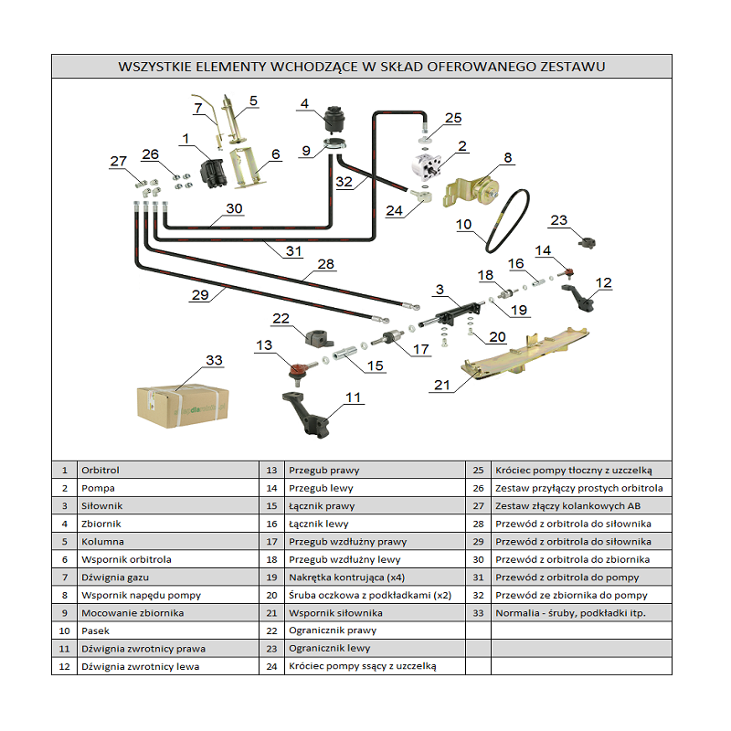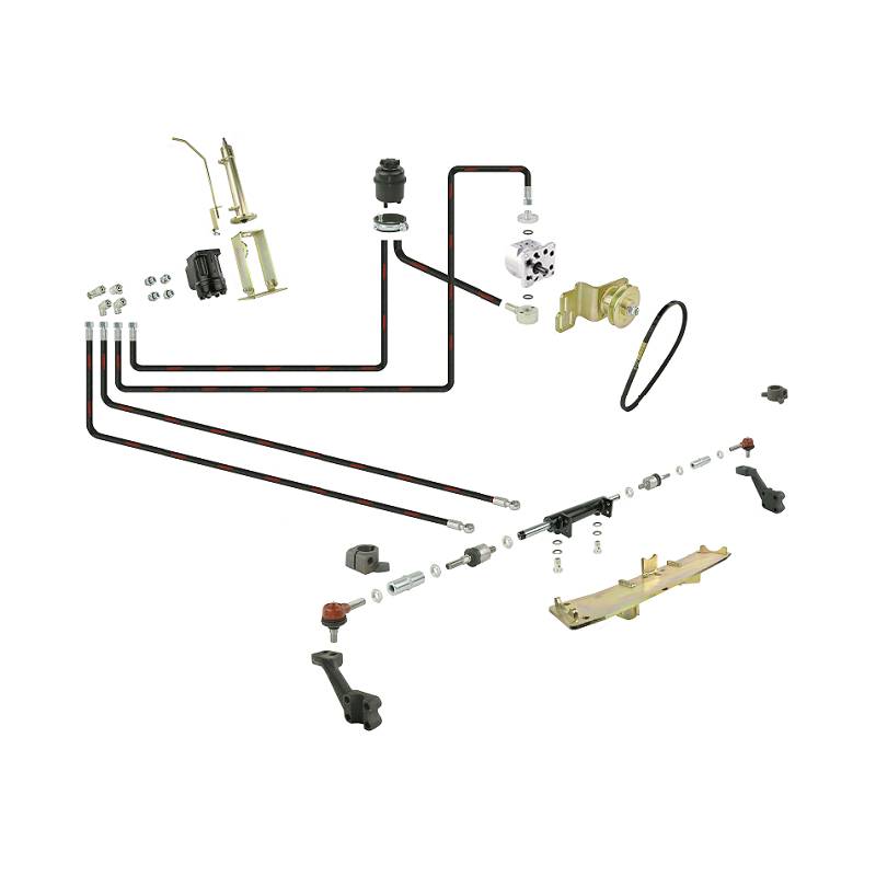Jednym z elementów jest napęd pompy montowany w miejscu sprężarki. Dzięki zastosowaniu wzmocnionej pompy Hydrotor Tuchola, układ pracuje płynnie. Kierowanie jest lekkie nawet przy niskich obrotach silnika. Ponadto, nowoczesny siłownik z podwójnym tłoczyskiem wysuwany jest na dwie strony. W zestawie znajdują się wszystkie niezbędne mocowania, przeguby oraz ramiona zwrotnicy. Przemyślana konstrukcja zapewnia równy skręt w lewo i prawo. Montaż odbywa się bezpośrednio do osi.