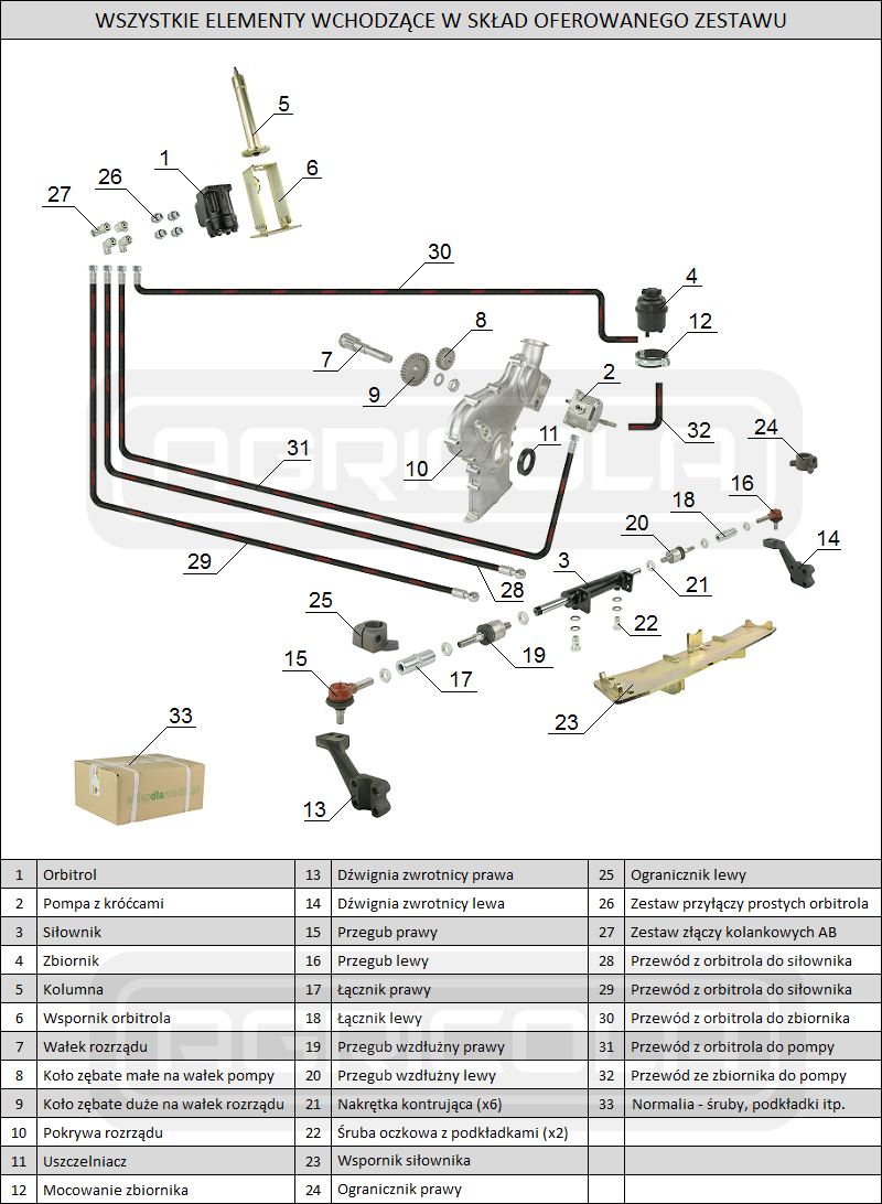 Jednym z najważniejszych elementów zestawu jest siłownik hydrauliczny z tłoczyskiem wysuwanym na dwie strony. Montowany jest on bezpośrednio do osi przedniej. Dzięki zastosowaniu podwójnego wysuwu, skręt kół w lewo i w prawo odbywa się z identyczną płynnością i precyzją. Zestaw obejmuje również kompletną kolumnę kierowniczą ze wspornikiem orbitrola, orbitrolem oraz nową dźwignią gazu. Orbitrol marki Hydrolider wyposażony jest w zawór bezpieczeństwa, który chroni układ hydrauliczny przed przeciążeniem i zapewnia precyzyjne prowadzenie kierownicy.