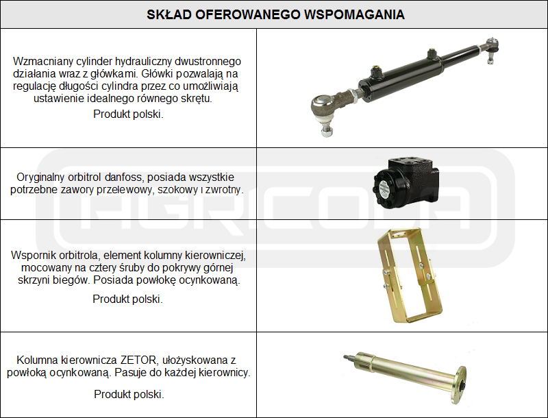 W komplecie znajduje się oryginalny orbitrol marki Danfoss. Gwarantuje on najwyższą jakość sterowania oraz płynność pracy układu kierowniczego. Wspomaganie to w pełni zastępuje fabryczny cylinder z rozdzielaczem i zapewnia nowoczesną, niezawodną obsługę skrętu. Zestaw został zaprojektowany z myślą o użytkownikach, którzy chcą unowocześnić swój ciągnik. Montaż wspomagania polega na wymianie starego układu na nowy, oparty na orbitrolu. System można zamontować w ciągnikach z napędem przednim lub bez napędu, a także w maszynach wyposażonych w ładowacz czołowy.